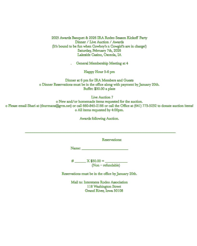 Finals Entries: Cut off for the Finals is August 16th. Shari will start calling the top 12 in each event prior to cutoff date. There are still 3 events to go so standings could change. Your money must be in the office by August 18th and cleared the bank before you can go to the finals. Address to mail your checks: IRA – 118 Washington Street – Grand River, IA 50108.